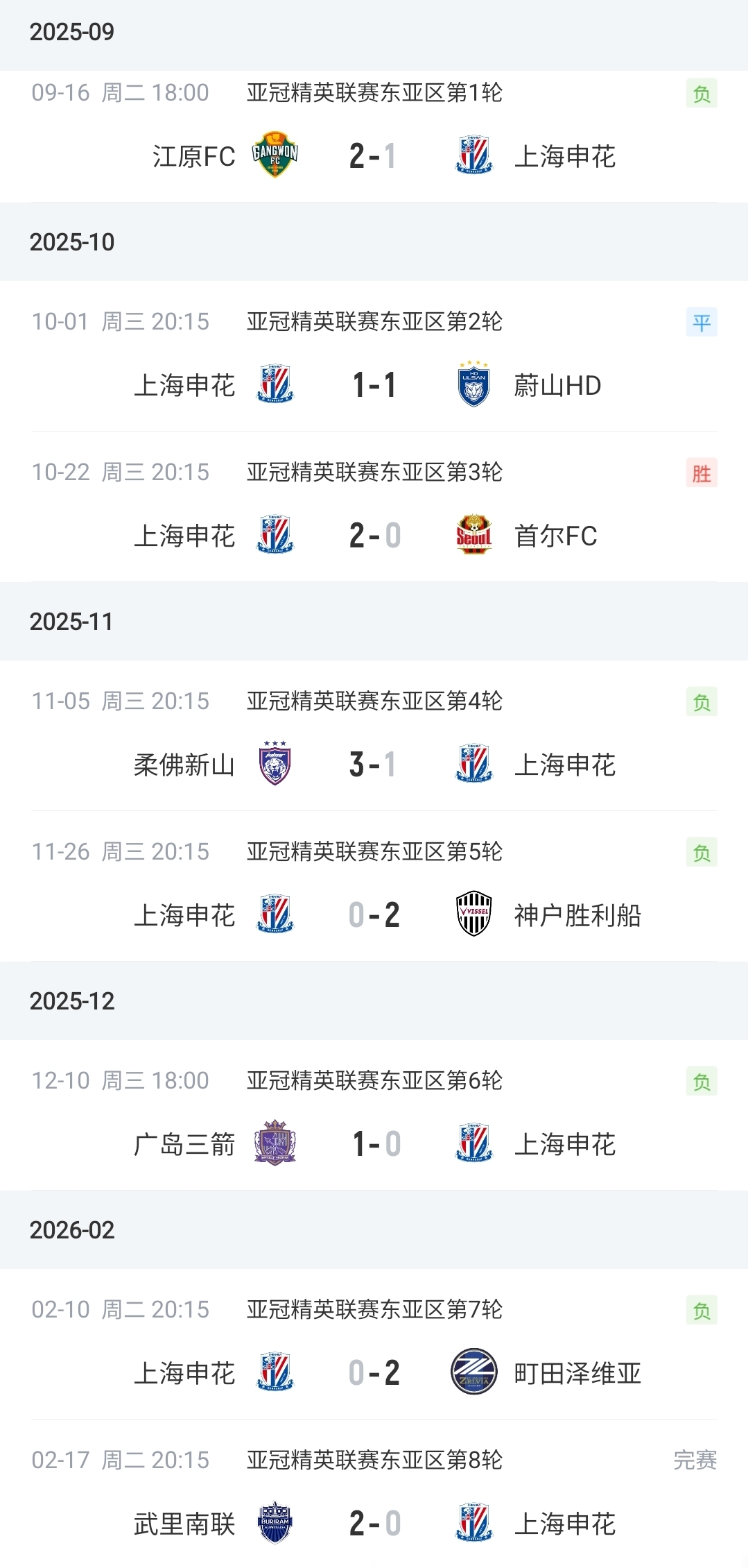 02月17日讯 亚冠精英职业联赛 东亚区第8轮,上海申花0-2不敌武里南联,8轮仅积4分倒数第二出局。