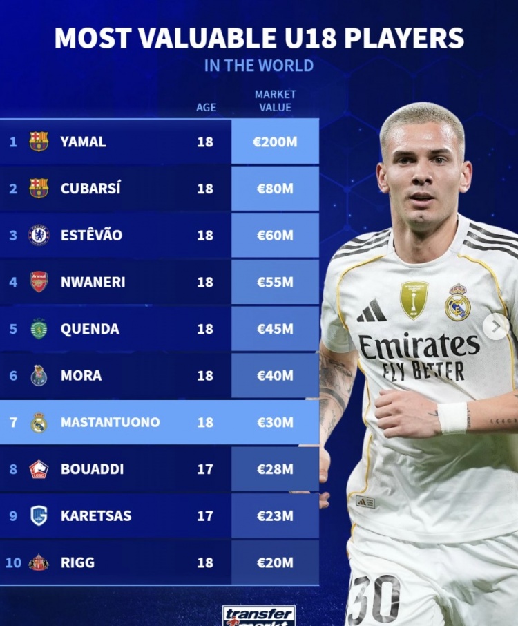 10月1日讯 德转更新世界U18球员身价榜,英超直播亚马尔2亿欧高居榜首。