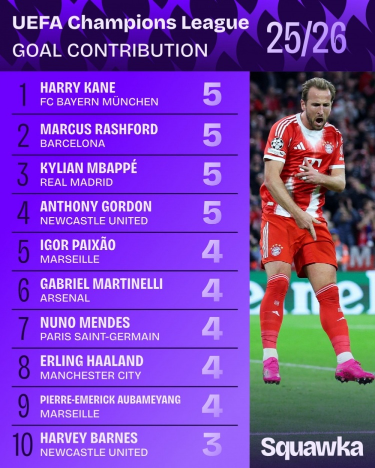 10月23日讯 本赛季欧冠职业联赛 阶段已战罢3轮,Squawka统计了到目前为止的加入 得分 榜,英超免费在线高清直播拜仁前场球员凯恩、巴萨攻击手拉什福德、皇马的姆巴佩以及纽卡翼锋安东尼-戈登均加入 5球。