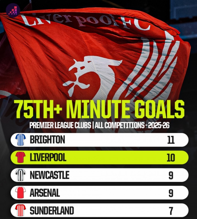 10月31日讯 数据机构OPTA统计了英超球队本赛季各项赛事在75分钟后的得分 情况,布莱顿力压利物浦居首。