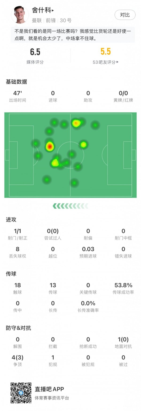 舍什科半场数据:1射1正,8次丢失球权,预期得分 0.03,评分6.59月15日讯 英超曼市德比上半场结束,曼联前场球员舍什科半场数据如下: 射球 :1射1正 丢失球权:8 预期得分 :0.03 触球:18 传送球 :13,成功率53.8% 地面对峙 :1 争顶:4,成功3 违例 :1