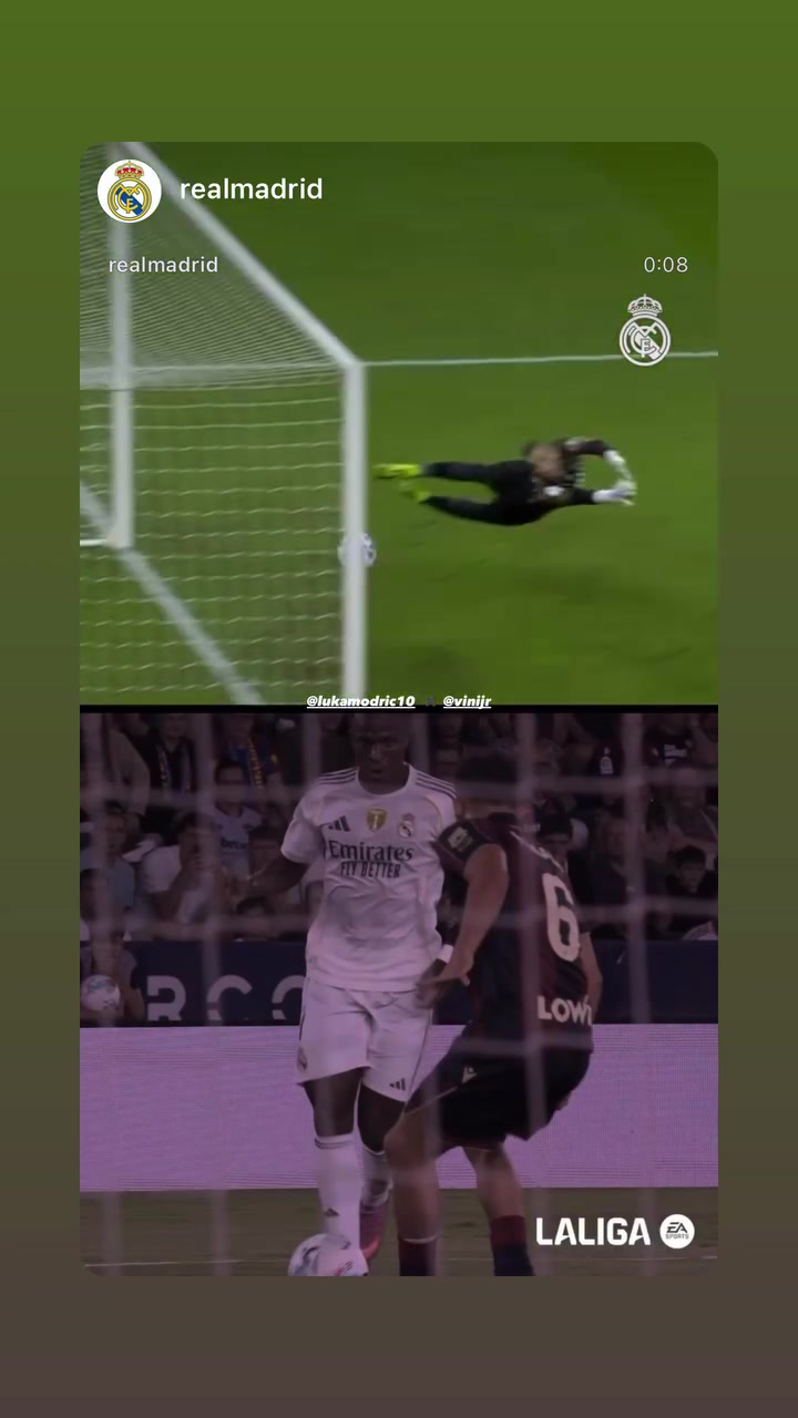 莫德里奇更新社媒动态,晒出自己与维尼修斯外脚背射球 的对比视频。