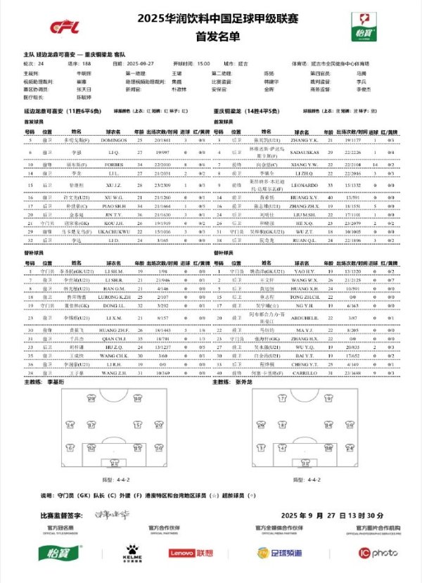 延边龙鼎vs重庆铜梁龙杆位:三外援对双外援、重庆新帅张外龙首秀9月27日讯 2025华润饮料中甲职业联赛 第24轮,延边龙鼎可喜安 vs 重庆铜梁龙杆位名单出炉,本场赛事 是重庆铜梁龙新任韩国籍主指导教练员张外龙首秀。 延边龙鼎杆位:21-寇家豪、15-徐继祖、17-朴世豪、20-金泰延、32-李达、5-多明戈斯、6-李强、14-李龙、16-许文光、10-福布斯、29-乌卡楚克乌 重庆铜梁
