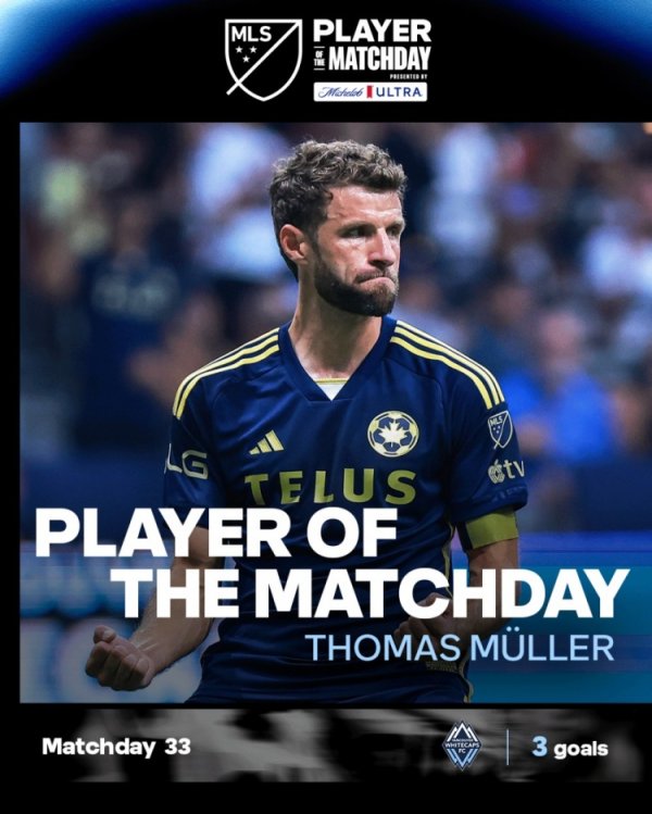 9月16日讯 美职职业联赛 事 ,穆勒36岁生日夜3射1传,帮助温哥华白浪主场作战 7-0击败费城联合。 美职联官方社媒晒出为穆勒制作的海报,宣布他当选本轮赛事 最佳球员。