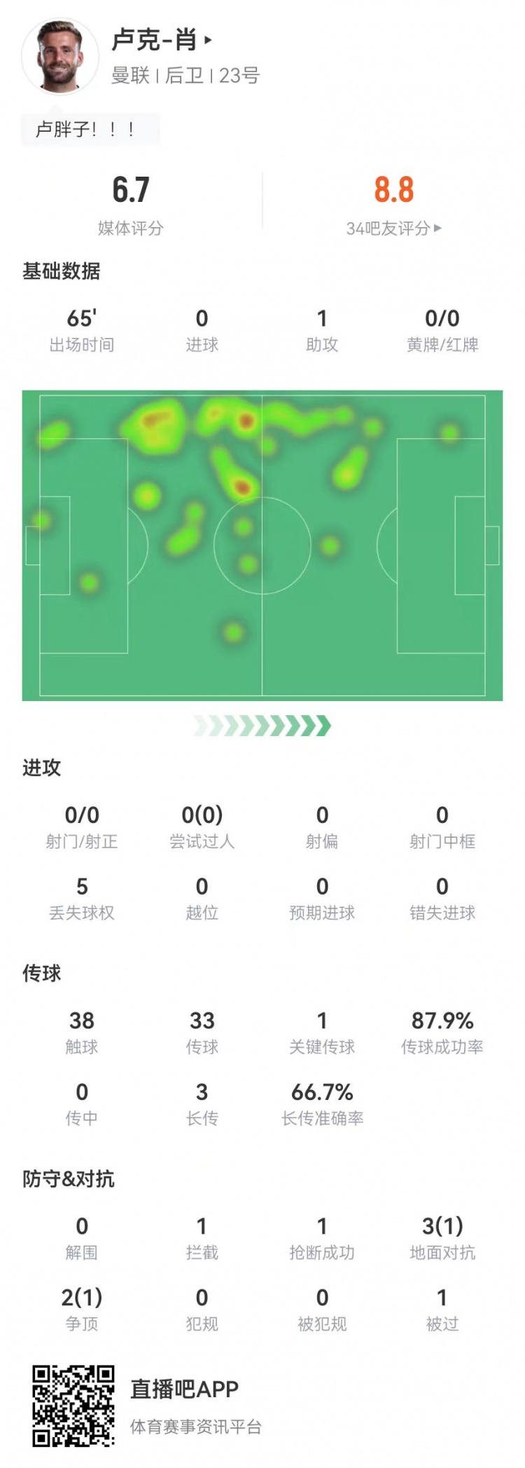 10月26日讯 曼联在本轮英超对阵布莱顿,卢克-肖本场数据如下: