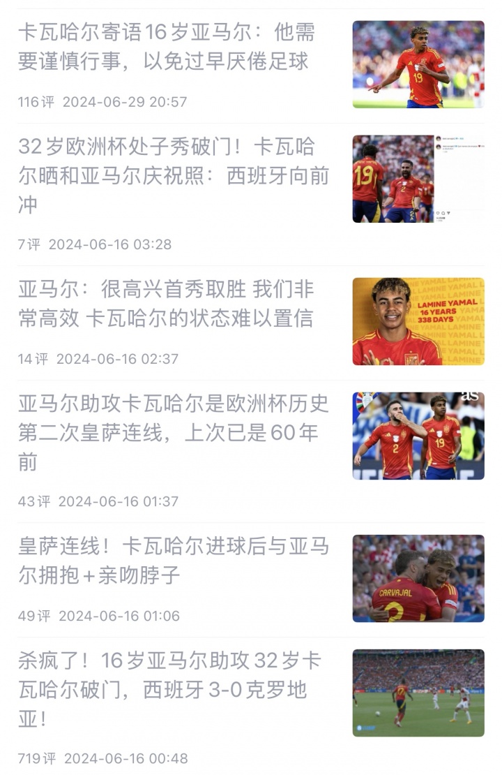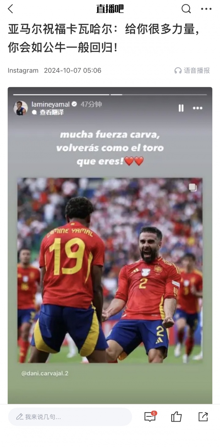不过此前有报道称,英超直播2024年欧洲杯之后,亚马尔关注了卡瓦哈尔。2024年欧洲杯亚马尔和卡瓦哈尔有很多互动,卡瓦哈尔多次鼓励亚马尔,后者在前者遭遇重伤的时候也通过社媒送上祝福。