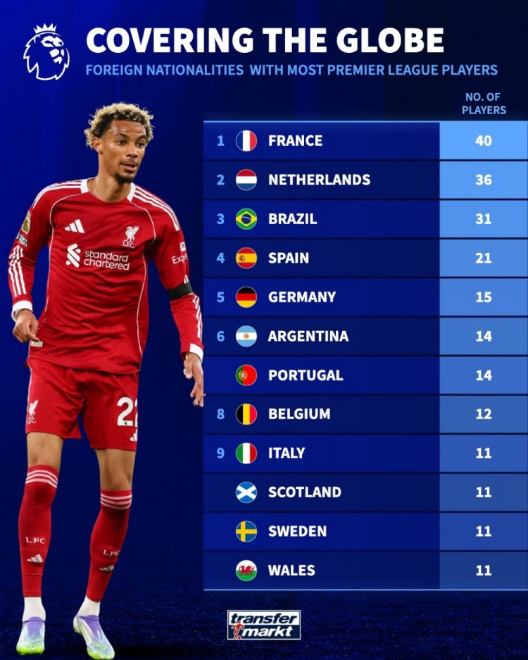 10月27日讯 《转会市场》统计了当前英超的各国家/地区的外援数量,英超免费在线高清直播法国球员多达40人。
