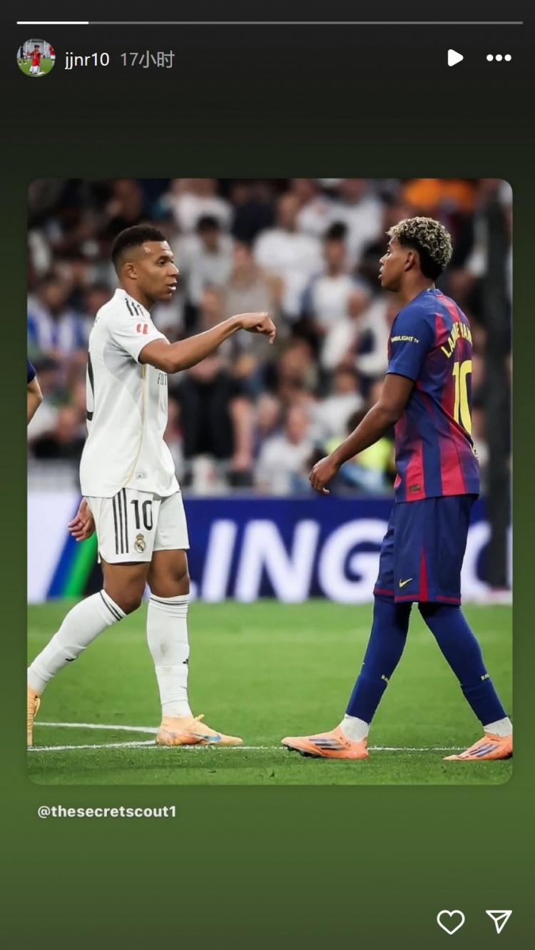 曼联15岁前场球员JJ-加布里埃尔也在关注西班牙国家德比,他在社交媒体上转发姆巴佩、亚马尔的赛场照片。