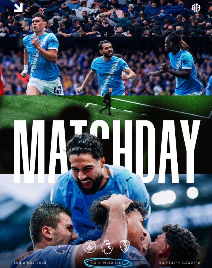 11月2日讯 本轮英超曼城将迎战伯恩茅斯。