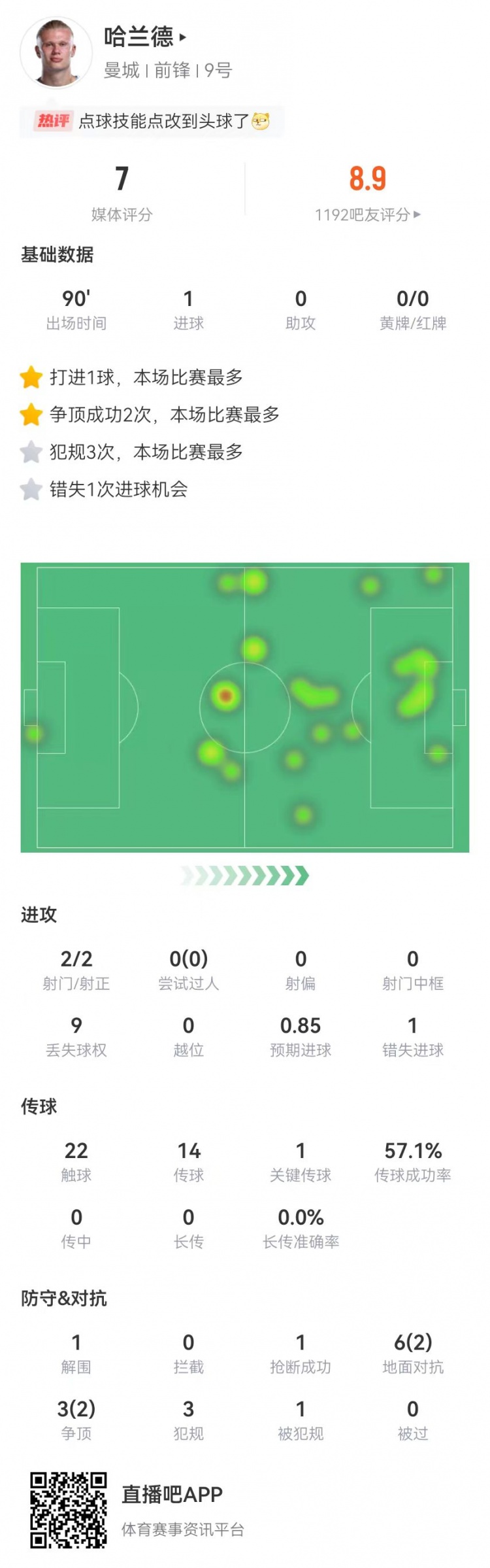 11月10日讯 曼城在本轮英超焦点战3-0完获胜 物浦,哈兰德本场数据如下: