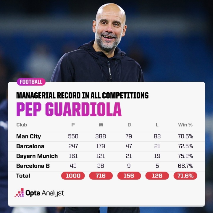 执教生涯1000场赛事 ,瓜迪奥拉取得了716胜156平128负的战绩,24直播网胜率超过7成。