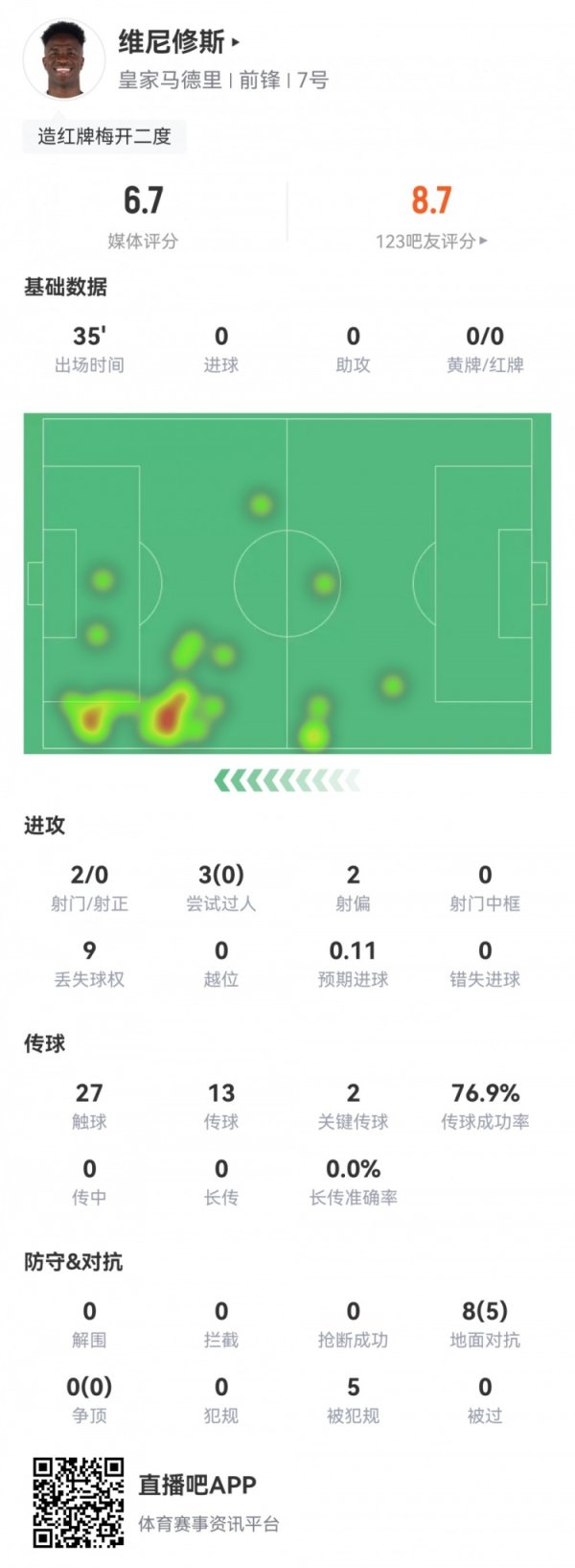 维尼修斯数据:后备 35分钟5次被违例 造两红,2次关键传送球 评分6.710月20日讯 本轮西甲,皇马1-0赫塔费。此役维尼修斯后备 35分钟,球员全场重积分 据如下↓ 2射0正 3次过人0成功 9次丢失球权 预期得分 0.11 27次触球 传送球 成功率76.9% 2次关键传送球 8次对峙 成功5次 5次被违例 评分6.7
