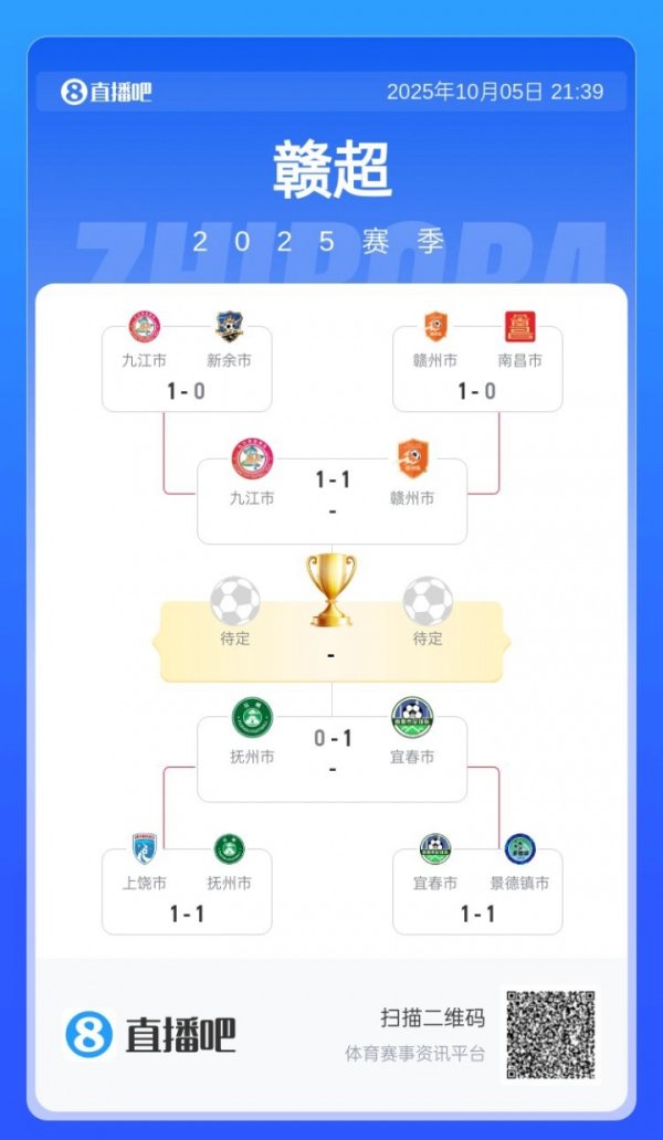 赣超准总决赛 首局 :宜春队1-0战胜抚州队,赣州队1-1战平九江队10月05日讯 赣超准总决赛 ,宜春队首局 1-0战胜抚州队,赣州队首局 1-1战平九江队。 次局 九江队10月11日周六坐镇主场作战 对阵赣州队,抚州队10月12日周日坐镇主场作战 对阵宜春队,届时将会决出总决赛 对手!