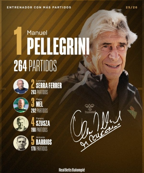 已成传奇!佩莱格里尼以264场成贝蒂斯队史执教场次最多的主指导教练员9月29日讯 西甲第7轮赛事 ,贝蒂斯在主场作战 迎战奥萨苏纳,佩莱格里尼迎来自己执教贝蒂斯的第264场赛事 ,这让他跨越 洛伦佐-塞拉-费雷尔成贝蒂斯队史执教场次最多的主指导教练员。 以下为贝蒂斯队史执教场次最多主指导教练员top5: 1、佩莱格里尼:264场 2、洛伦佐-塞拉-费雷尔:263场 3、佩佩-梅尔:202场 4、