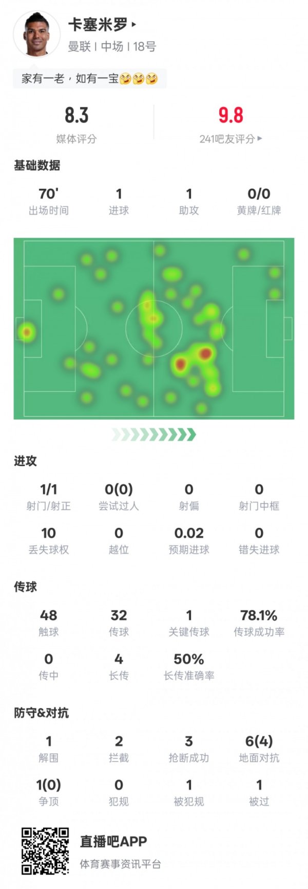 卡塞米罗本场数据:传射建功+1关键传送球 3抄截 ,评分8.310月26日讯 2025-26赛季英超职业联赛 第9轮,曼联主场作战 迎战布莱顿。卡塞米罗杆位出战,传射建功,还送出1次关键传送球 ,3次抄截 ,评分8.3。 卡塞米罗本场赛事 数据: 得分 1 助功 1 射球 1 射正1 丢失球权10 触球48 传送球 32 关键传送球 1 传送球 成功率78.1% 长传4 长传准确率50%