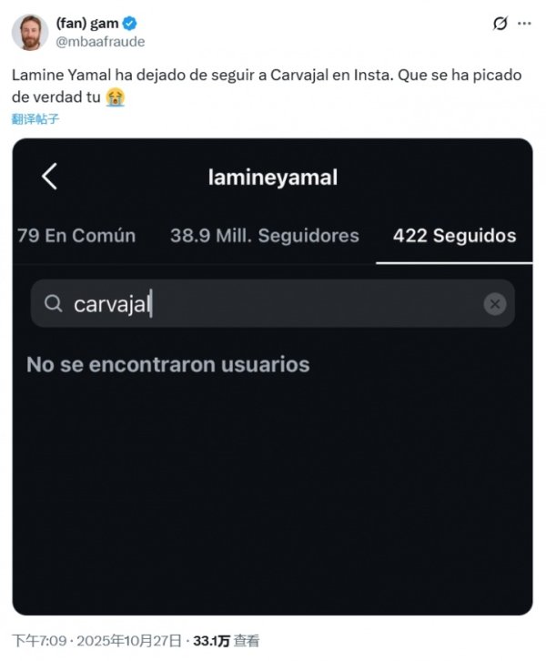 球迷发文热议亚马尔取关卡瓦哈尔,目前两人确实没有互相关注10月27日讯 今天西班牙国家德比之后,有不少球迷发文表示亚马尔取关了卡瓦哈尔,经查证目前两人确实未互相关注,但是否是因为今天两人的冲突取消关注还有待确认。 不过此前有报道称,2024年欧洲杯之后,亚马尔关注了卡瓦哈尔。2024年欧洲杯亚马尔和卡瓦哈尔有很多互动,卡瓦哈尔多次鼓励亚马尔,后者在前者遭遇重伤的时候也通过社媒送上祝福