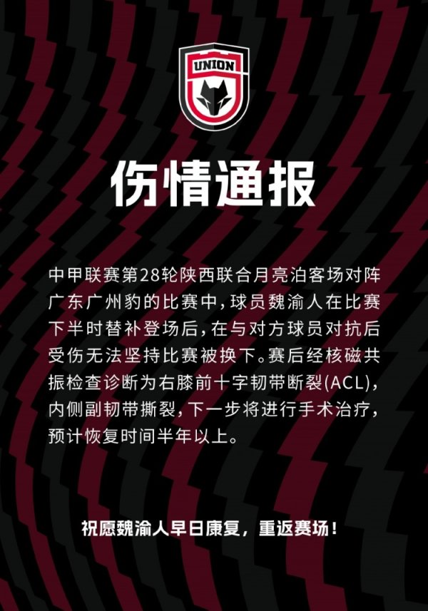 伤情通报:球员魏渝人右膝前十字韧带断裂、内侧副韧带撕裂 2025-11-24 -