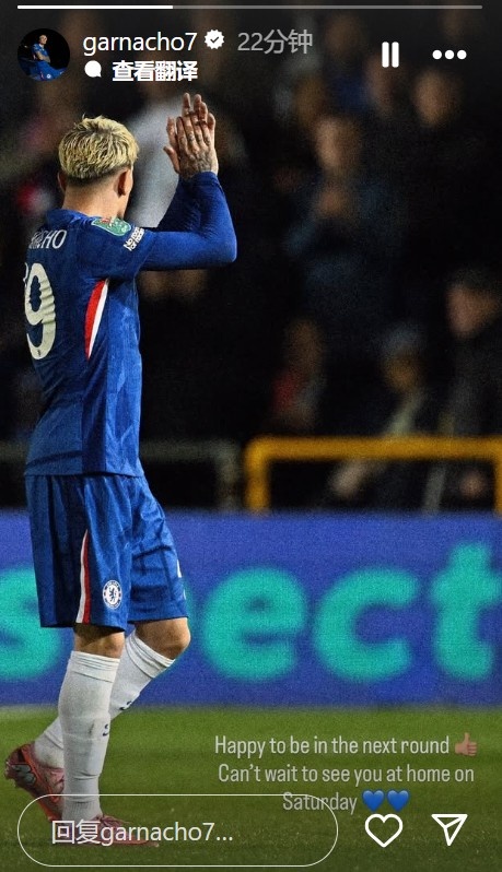 加纳乔写道:“很高兴晋级下一轮 下一轮 👍🏽迫不及待想在周六主场作战 见到你们!”