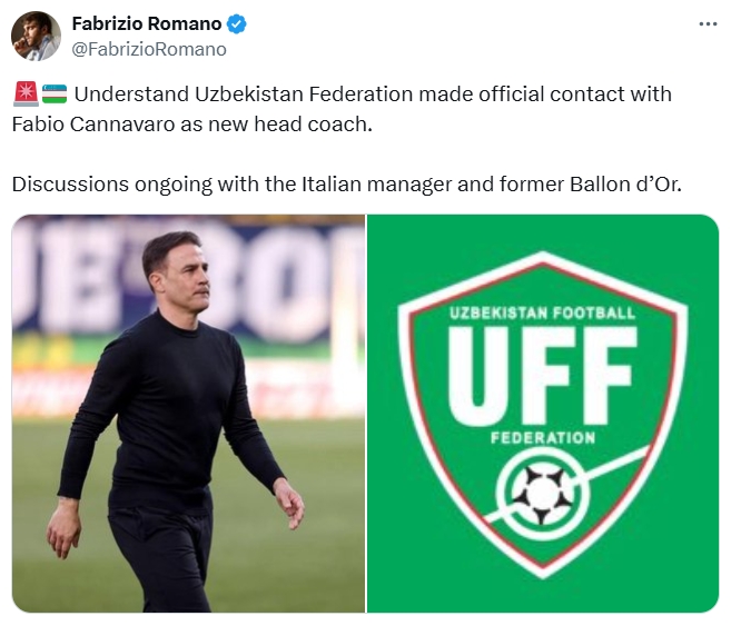 罗马诺获悉,乌兹别克斯坦足协已经正式接触了卡纳瓦罗,讨论其执教乌兹别克斯坦国家队的事宜,英超比赛在线观看无插件目前双方的谈判正在进行。