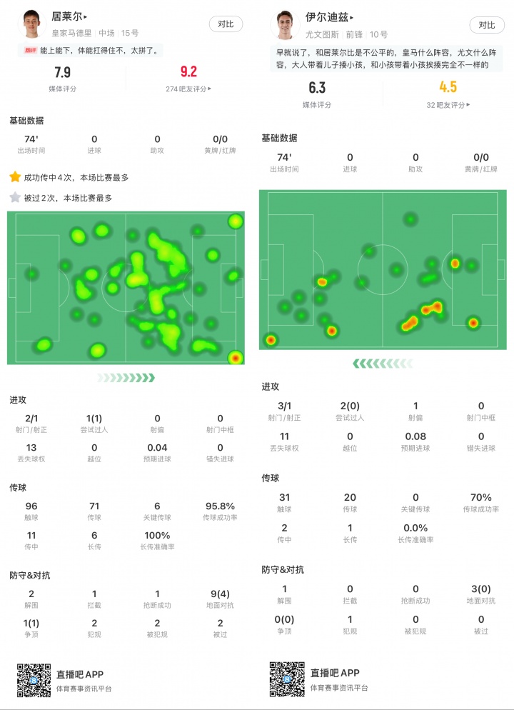 10月23日讯 欧冠职业联赛 阶段第3轮,皇马主场作战 1-0尤文,居莱尔与伊尔迪兹均杆位出场74分钟被换下,居莱尔当选最有价值球员,伊尔迪兹被打全场第二低分。