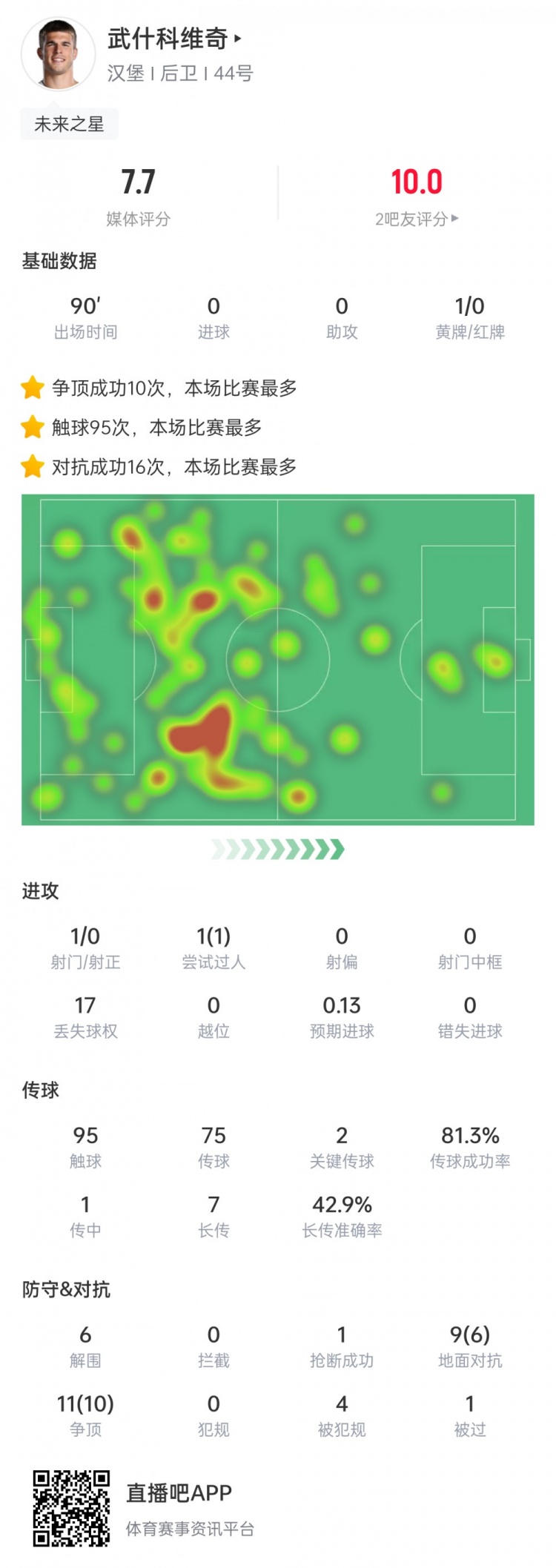 此役武什科维奇争顶成功10次,全场最多。据Sofascore统计,英超直播本赛季武什科维奇在2场职业联赛 中争顶成功10+并且成功率超过90%,而五大职业联赛 其他2021名球员加起来也只做到2次。