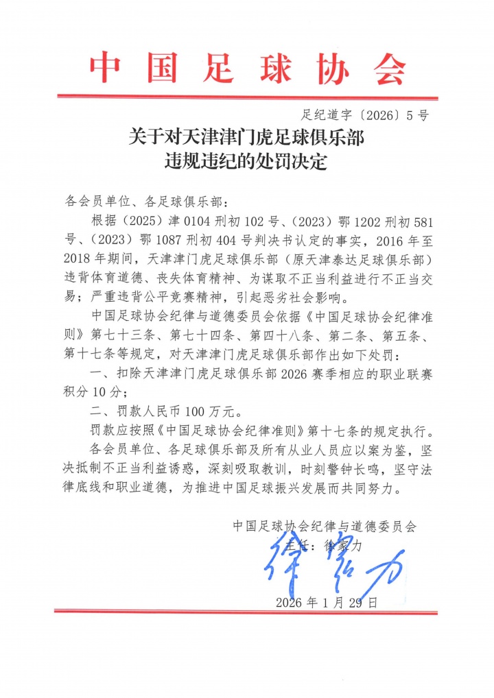 01月29日讯 中国足协今日正式公布了“假赌黑”专项整治行动受处罚的俱乐部名单。津门虎被扣10分并罚款100万元,俱乐部官方进行了回应。