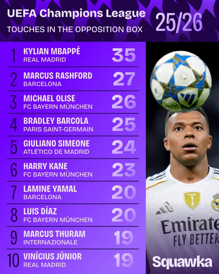 10月23日讯 本赛季欧冠职业联赛 阶段已战罢3轮,Squawka统计了到目前为止对方危险区域 内触球次数榜单,24直播网姆巴佩35次第一,拉什福德27次第二。