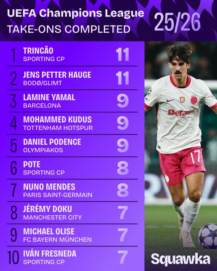 10月23日讯 本赛季欧冠职业联赛 阶段已战罢3轮,Squawka统计了到目前为止完成过人榜单,英超比赛在线观看无插件葡体前场球员特林康和博德闪耀攻击手海于格都是11次,分列前二。