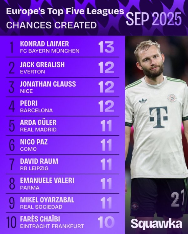 9月份五大职业联赛 创造机会榜:莱默尔第1,格拉利什第2,佩德里第410月1日讯 Squawka统计了欧洲五大职业联赛 球员在9月份的创造机会次数榜单,拜仁后场球员莱默尔位列第一。 1.莱默尔(拜仁)13次 2.格拉利什(埃弗顿)12次 3.克劳斯(尼斯)12次 4.佩德里(巴萨)12次 5.居勒尔(皇马)11次 6.帕斯(科莫)11次 7.劳姆(RB莱比锡)11次 8.瓦列里(帕尔马)11次
